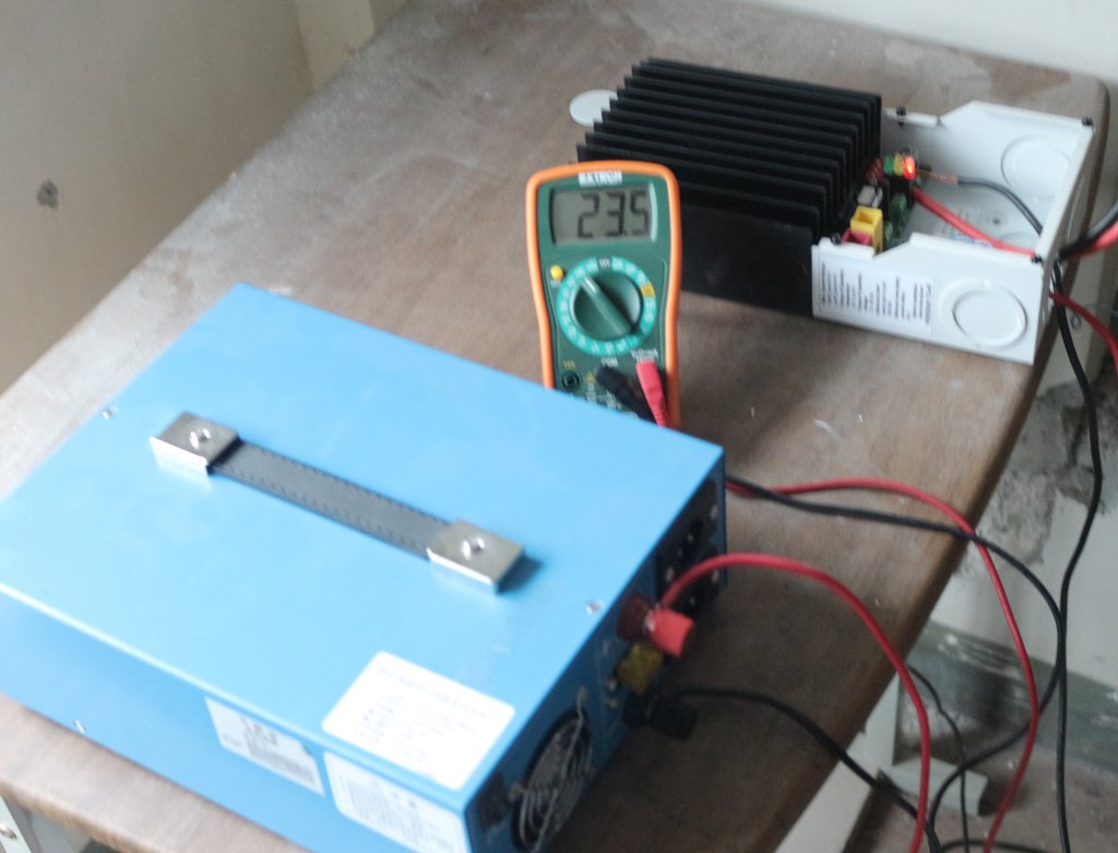 The 45A charge controller (right) and the 600W inverter (left). The voltmeter showing 23.5V across two batteries which means the batteries have low charge.